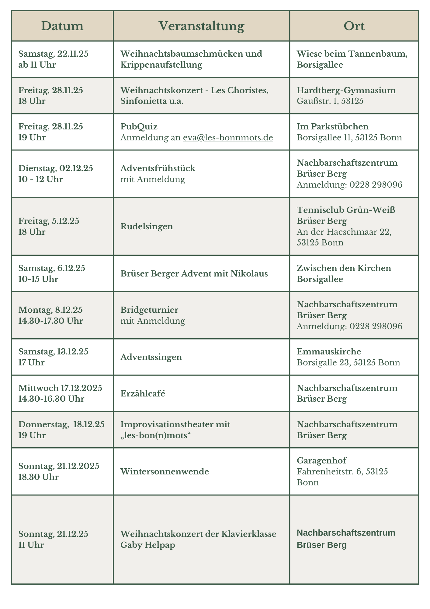 Die Besucher:innen erwarten vielfältige Veranstaltungen. Im Parkstübchen wird gequizzt, im Tennisclub gesungen, im NBB gespielt und improvisiert. Auch das Hardtberg-Gymnasium ist mit einem Weihnachtskonzert dabei.